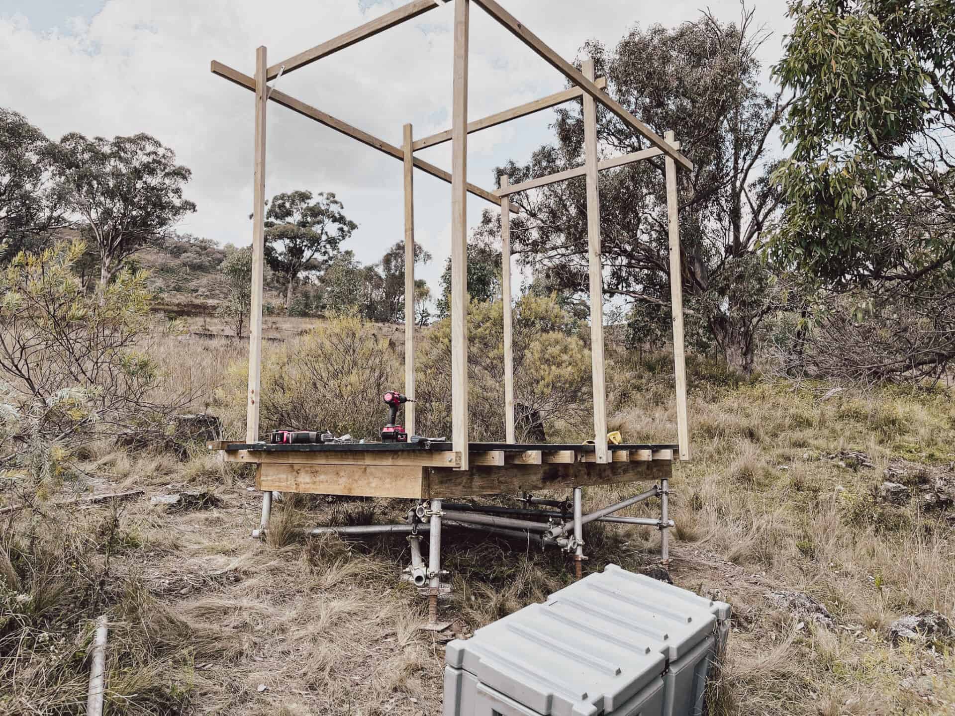 version 1.0 was built as a simple platform on the edge of the camp. A basic frame was built to support shower curtains for privacy.