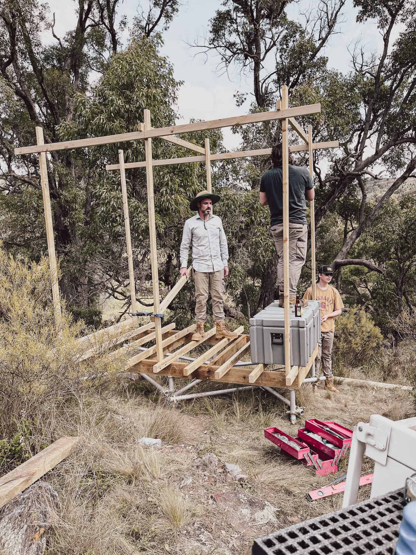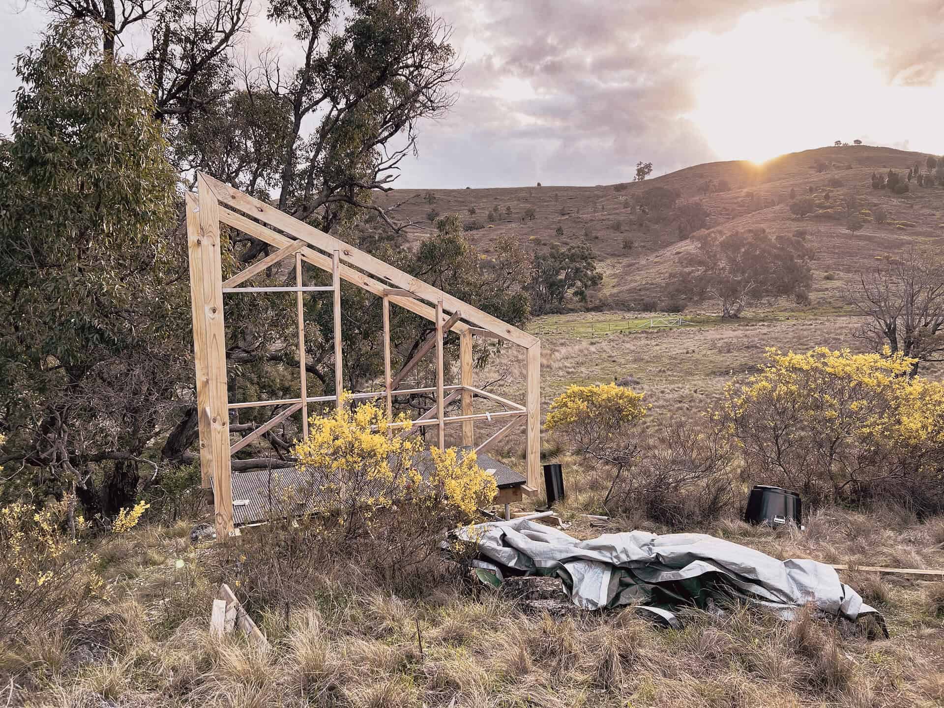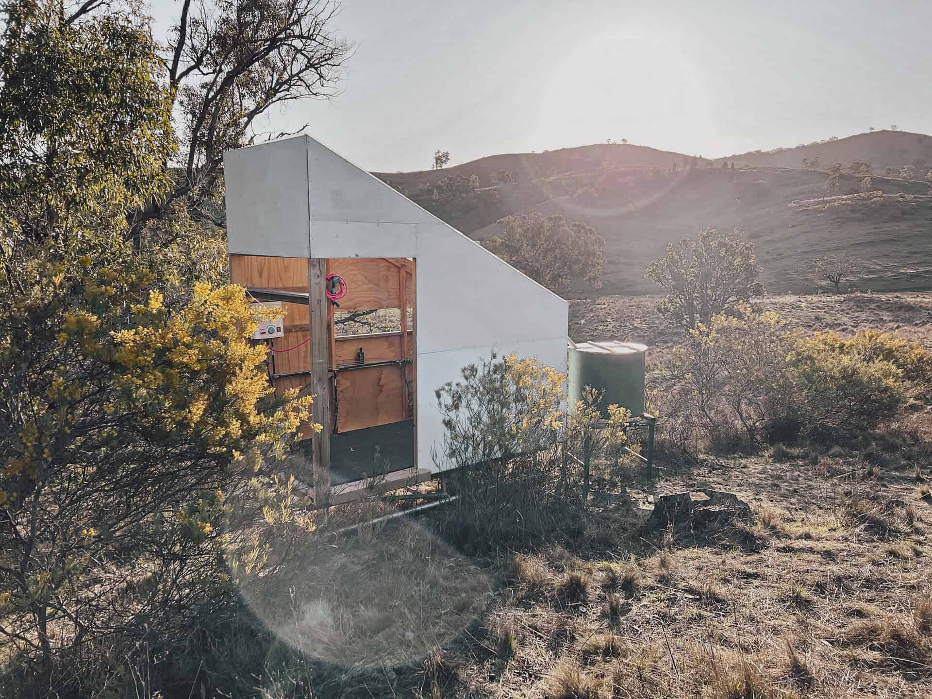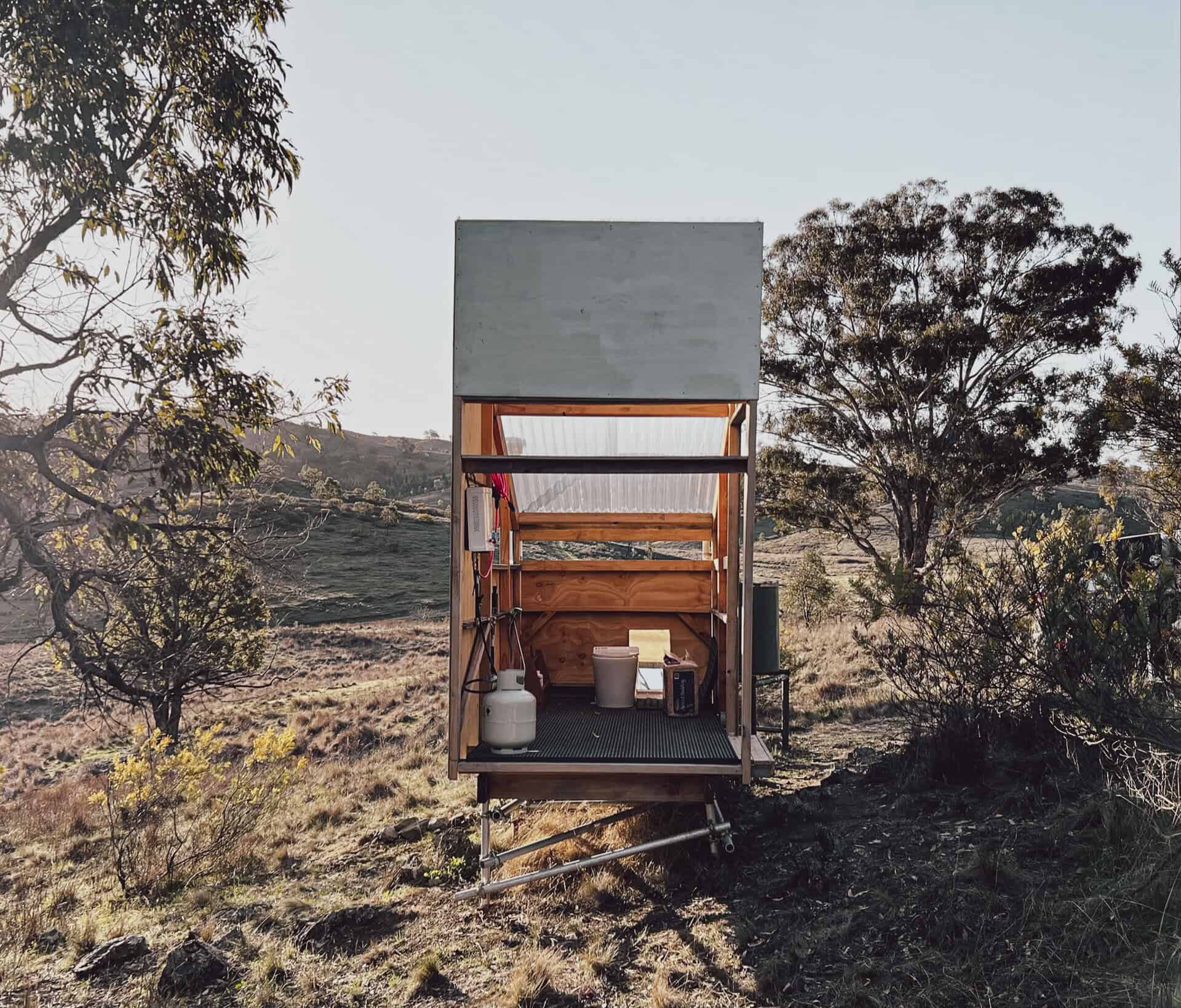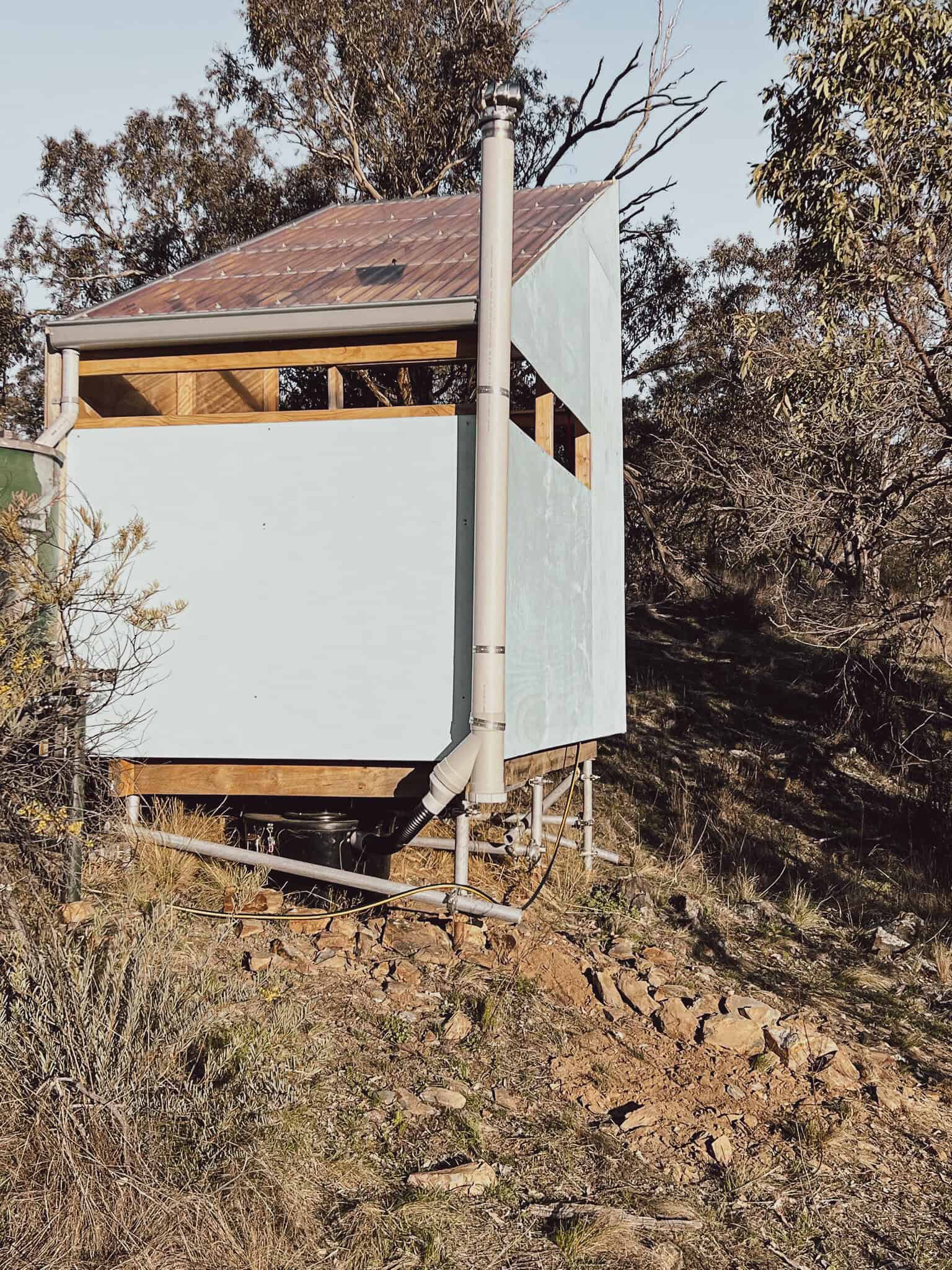 Version 2.0 became an adaption of the original shower block, looking to provide a sturdier frame and test form proportions in preparation for future shed construction. The new version features a porcelain composting toilet, 600L stainless steel water tank and gas hot water heating.